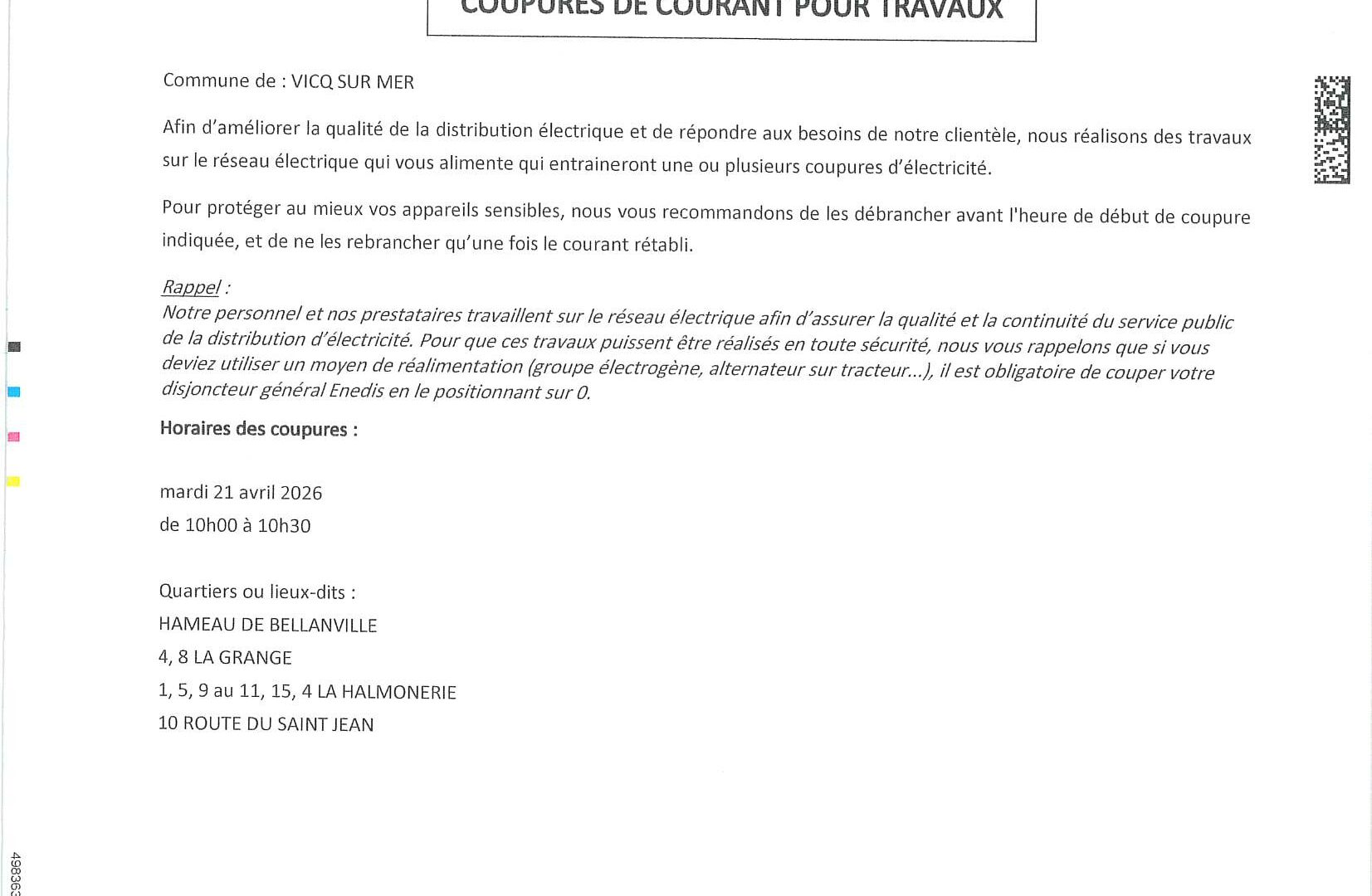 Une coupure de courant pour travaux est prévue le mardi 21 avril de 10h00 à 10h30 sur les secteurs de Bellanville, la Grange, la Halmonerie et la route du Saint Jean.
